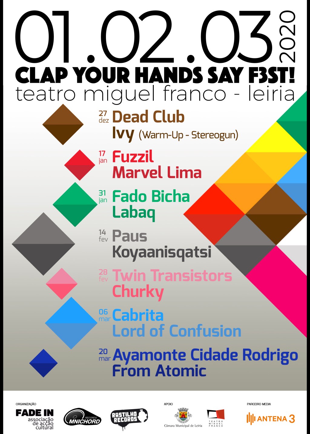 CLAP YOUR HANDS SAY F3ST! é um festival que resulta da união de esforços e da colaboração entre três entidades de créditos firmados: Fade In – Associação de Acção Cultural, Omnichord Records e Rastilho Records. Com os apoios da Câmara Municipal de Leiria e da Antena 3, a quarta edição do evento decorrerá durante o primeiro trimestre de 2020 no bonito e estilizado Teatro Miguel Franco, em pleno coração da cidade do Lis.