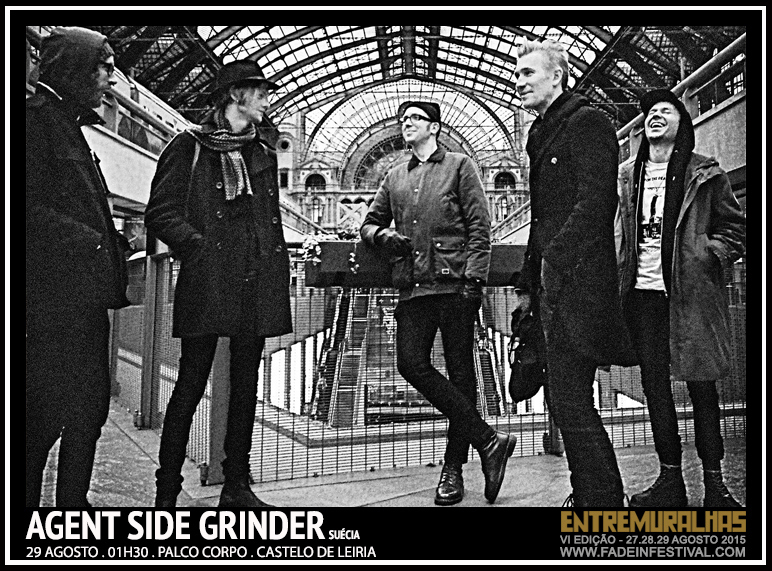 Os AGENT SIDE GRINDER chegam-nos de Estocolmo, Suécia. Juntos desde 2005, o quinteto constituído por Kristoffer Grip (voz), Johan Lange (sintetizadores), Henrik Sunbring (sintetizadores), Peter Fristedt (sintetizadores modularas, tape-loops e artefactos percurtivos) e por Thobias Eidevald (baixo de sonoridade “peter-hookiana”), dá corpo aquela que é, para nós, a mais empolgante e apelativa banda de post-punk de reminiscências industriais da actualidade, e uma das que mais ansiávamos ter no currículo da Fade In. É pois com enorme orgulho que a ostentamos no cartaz do ENTREMURALHAS 2015. Os espólio criativo dos AGENT SIDE GRINDER começou a ser erigido com o álbum homónimo editado em 2008, ao qual se seguiu, em 2009, “Irish Recording Tape”, dois discos que traçavam, desde logo, a personalizada caminhada do grupo, mas onde pairava, ainda, uma certa aura experimental. Estas duas obras iniciais foram suficientes para que o colectivo ganhasse uma reputação crescente por toda a Europa. Mas foi com “Hardware”, o disco de 2013, que a banda revelou uma capacidade expansionista, quer em termos estéticos (mais apurados e estilizados) quer em termos geográficos (a aclamação extrapolou a do velho continente) arrebatando o título de “álbum do mês” na Vice Magazine e aparecendo nas listagens de melhores discos do ano em publicações como a Time Out Paris – vindo mesmo a ganhar o “Manifest Award” (os Grammy indie suecos) de melhor álbum “synth” de 2013. Os AGENT SIDE GRINDER já “andaram na estrada” com nomes como Cold Cave ou Suicide, e têm colaborado com outros, como os cada vez mais emergentes Kite, o firmado Henric De La Cour, ou o histórico Dirk Ivens, líder dos The Klinik, Dive e Absolute Body Control. Ao vivo, a excelência da banda reforça-se e cresce substancialmente. A presença de Kristoffer Grip em palco, com uma postura verdadeiramente carismática, não deixa absolutamente ninguém indiferente. 2015 verá a luz de “Alkimia”, o novo álbum da banda e também, finalmente, a sua estreia ao vivo no nosso país. Por tudo isto, e na condição de fãs incondicionais, as nossas expectativas estão ao rubro!