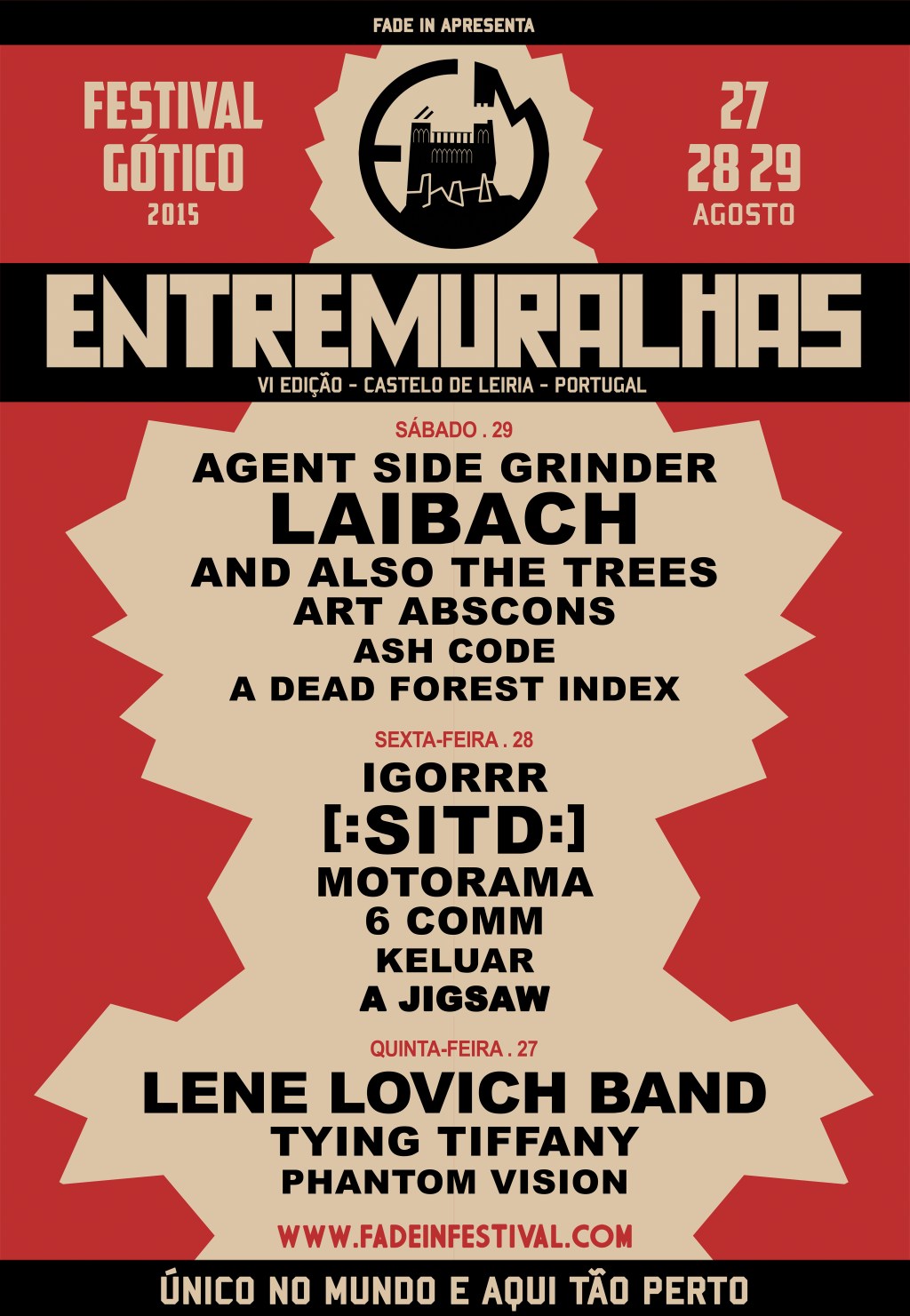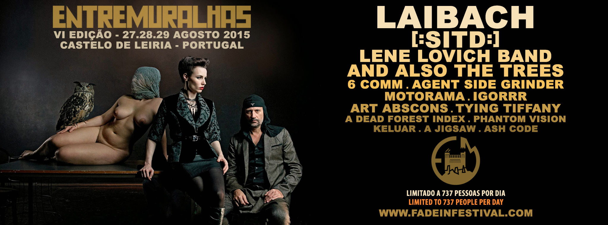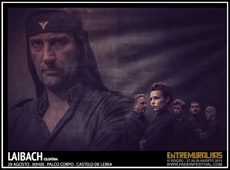 Dez anos depois de os ter trazido pela primeira vez e em exclusivo a Portugal, a FADE IN volta, com desmesurado orgulho e honra, a ostentar no seu currículo os históricos, iconográficos, provocadores e inimitáveis LAIBACH – desta vez para assinar a ouro o cartaz do ENTREMURALHAS 2015. Sintetizar em tão poucas linhas a obra e a importância desta banda é quase um crime de lesa-estado. E “Estado” é uma palavra intrínseca aos próprios LAIBACH. Para além de terem tido um papel de enorme relevância na independência da Eslovénia (o grupo, sedeado na cidade de Trbovlje, é mesmo um simbolo nacional) os LAIBACH são ainda membros fundadores da NSK – Neue Slowenische Kunst (Nova Arte Eslovena), um controverso colectivo político e artístico que, entre outros, criou um Estado virtual, sem território físico, mas com cidadãos titulares de passaportes e com consulados em várias cidades da Europa. A estética musical dos LAIBACH tem vindo a sofrer alterações de década para década. Os seus 35 anos de carreira começaram na música industrial no seu estado mais puro e virginal. Os anos 80 foram, pois, marcados pelos ritmos e percurssões maquinais e fabris, vocalizações graves e coros wagnerianos, onde nem sequer faltaram versões dos Rolling Stones, Queen e Opus (com os LAIBACH a interpretarem “Life Is Life” de uma forma subversiva, transformando aquele êxito numa marcha militarista triunfal) e o álbum “Let It Be”, dos Beatles, a ser versionado na sua totalidade. Nos anos 90 a banda experimentou as electrónicas e, posteriormente, a fusão destas com as guitarras de riffs pesados, num álbum intitulado “Jesus Christ Superstar”, que acabou por influenciar toda uma nova corrente de bandas e de miscigenações de estilos. “WAT” de 2003, “Volk” de 2006 e “Spectre” de 2014 são já álbuns de pura sofisticação, com sonoplastias técnicas do mais fino recorte, temas fenomenalmente escritos e produzidos, de crítica política/social afiada e inteligente, mordaz e incisiva, que nos continuam a mostrar uma banda com um vastíssimo manancial e arrojo estético, materializado com todo o seu esplendor nas suas estupendas prestações ao vivo. A propósito do concerto dos LAIBACH na Tate Modern em Londres – a galeria de arte moderna mais visitada do mundo – escrevia o jornal The Guardian o seguinte: “Laibach at their best blur art and confrontation”. Portanto, a arte e o confronto como um todo indivisível. Não há outra banda assim…