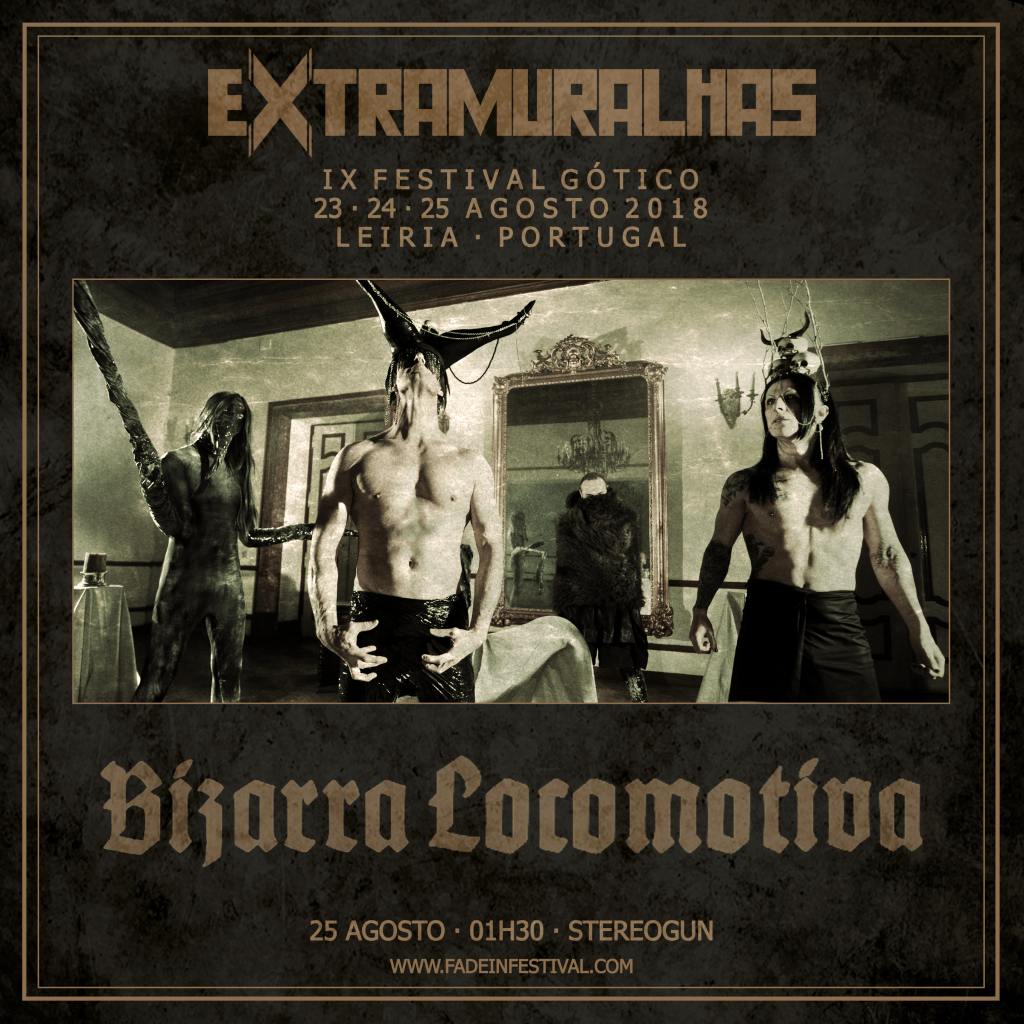 A FADE IN – Associação de Acção Cultural tem a honra de acolher os portugueses BIZARRA LOCOMOTIVA na nona edição do “seu” festival gótico, precisamente no ano em que esta carismática banda nacional comemora os seus 25 anos de carreira. Há muita matéria relevante na história deste colectivo, mas o que realmente impressiona é a verticalidade do seu trajecto estético, tão sólido quanto singular, o que torna os BIZARRA LOCOMOTIVA numa banda com um conjunto de idiossincrasias ímpares (passe a redundância) e de território definido no panorama da música portuguesa. Entre as suas mais notadas particularidades, destacam-se o aprumo visual com que desde sempre se apresentaram em público, as letras inteligentes, imagéticas, repletas de alusões sórdidas, em bom e rebuscado português, as dicotomias entre a máquina e o homem (tema transversal no universo lírico da banda) e, claro, as suas incríveis e avassaladoras prestações ao vivo, sempre muito físicas e “viscerais”, ainda que, também, bastante sofisticadas. A voz de Rui Sidónio, gutural, é outro dos elementos que mais contribuiu para a consolidação deste demarcado e característico complexo sonoro. Ao olharmos para trás, encontramos no currículo da banda uma série de efemérides marcantes como partilha de palcos com nomes como Marilyn Manson, The Young Gods, Korn, Blur, Soulfly e Moonspell (com quem, aliás, fizeram uma recente tour ibérica), ou ainda, por exemplo, on facto do álbum “Mortuário” ter sido masterizado por Thomas Eberger (Rammstein/Opeth) nos famosos Stockholm Mastering Studios. Todavia, tão notável quanto as valências e o currículo da banda, é a fiel horda de fãs (conhecidos como “escumalha” – epíteto herdado de um dos seus mais emblemáticos e vorazes temas) que se desloca a todo o lado e ajuda esgotar os espaços onde quer que os BIZARRA LOCOMOTIVA se apresentem ao vivo. Aliás, a simbiose entre a banda e os seus seguidores é de uma cumplicidade e dedicação notáveis, ou não fosse, certamente, toda essa “escumalha” crescente, o maior combustível para que uma locomotiva tão bizarra quanto esta esteja mais veloz, poderosa e oleada que nunca! E não será no EXTRAMURALHAS 2018 que a notável máquina de Rui Sidónio, Miguel Fonseca, Alpha e Rui Berton, por certo, abrandará a sua imponente e contagiante vitalidade!