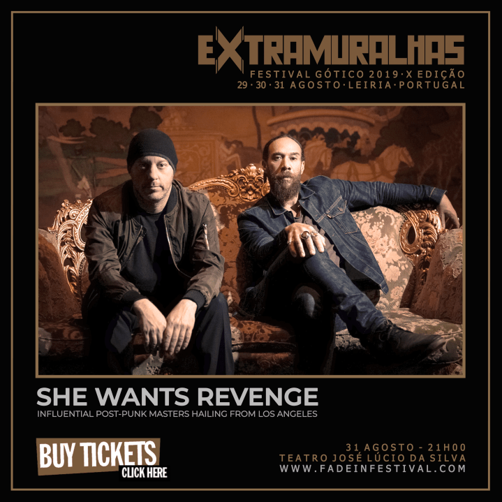 Os californianos SHE WANTS REVENGE eram, há muito, um dos nomes que a FADE IN ambicionava ter no seu currículo e são, por isso, uma grande aposta para o cartaz do EXTRAMURALHAS 2019. A sonoridade dos autores de inesquecíveis temas como “Tear You Apart”, “She Loves Me, She Loves Me Not”, “Animal Attraction” ou “I Don’t Wanna Fall In Love” (todos eles, grandes hits nas pistas de dança mais criteriosas do planeta) sintetiza, na perfeição, aquilo que poderíamos designar como um híbrido que funde, com sucesso, o legado post-punk da Manchester dos anos 80, com resquícios de rock-gótico, new-wave e electro-pop. A essa fórmula, acrescentam a “cereja no topo do bolo”: uma aptidão inata para tornar as suas canções em instantâneos hinos que nos viciam e arrebatam. Não é por isso de estranhar que os SHE WANTS REVENGE sejam transversalmente venerados por melómanos de diferentes quadrantes estéticos e se tenham transformado, eles próprios, numa banda influente que desde 2005 tem vindo a servir de inspiração assumida por um largo número de outras bandas em todo o mundo. Será, pois, com grande prazer e orgulho que a FADE IN receberá em Leiria, Justin Warfield, Adam Bravin e companheiros. Os SHE WANTS REVENGE aproveitarão para mostrar ao vivo a veia (trágico)romântica que (também) os caracteriza e que serve de mote à sua auto-definição: “Sounds like Winter. Feels like the first kiss…”