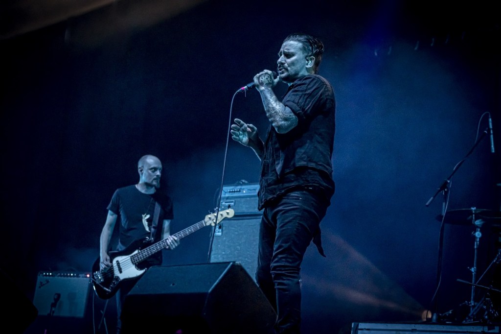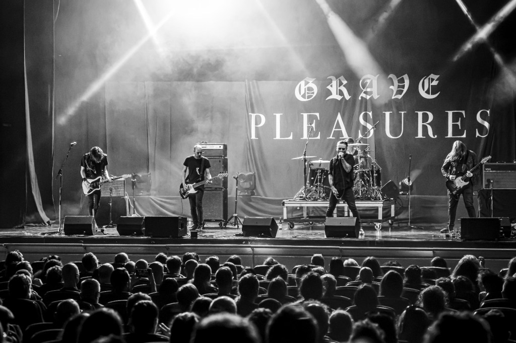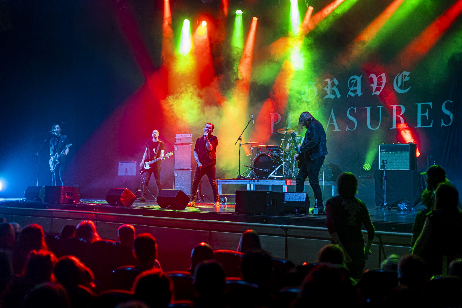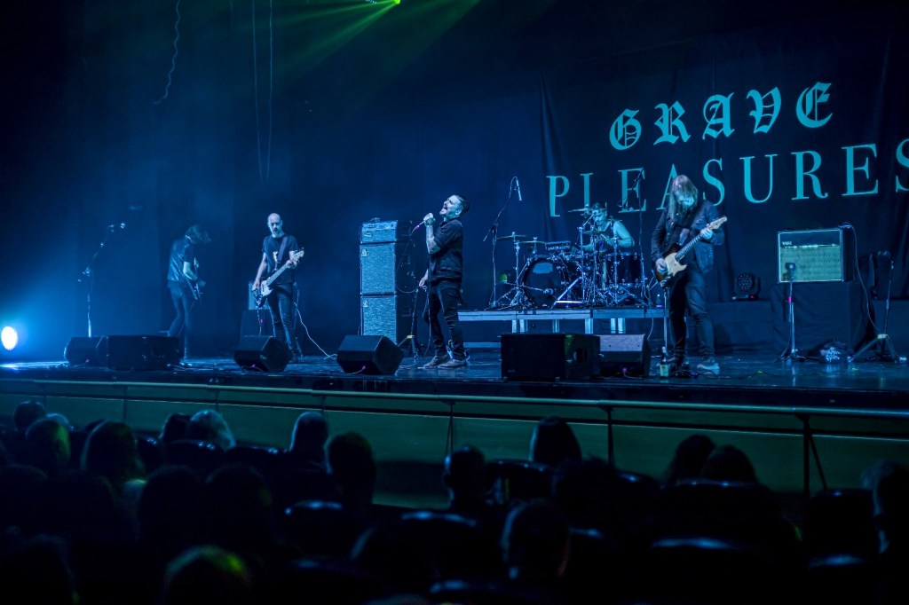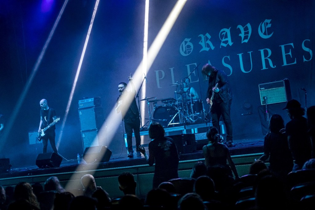 THE FINNISH BAND GRAVE PLEASURES CAME TO EXTRAMURALHAS 2023 TO PRIMARILY SHOWCASE THE SONGS FROM THEIR EXTRAORDINARY ALBUM ‘PLAGUEBOYS.’ THE EXCELLENCE OF THE SONGS FROM THIS RECORD WAS CLEARLY EVIDENT IN HOW THE CHORUSES OF ‘LEAD BALLOONS’, ‘CONSPIRACY OF LOVE’, ‘TEARS ON THE CAMERA LENS’, AND THE TITLE TRACK ‘PLAGUEBOYS’ RESONATED IN OUR HEADS. THE FEAST OF APOCALYPTIC DEATH-ROCK CONSTRUCTED IN STRUCTURES REMINISCENT OF POST-PUNK BY THIS QUINTET FORMED BY ACCOMPLISHED MUSICIANS AND LED BY THE DISTINCTIVE VOICE OF IRISHMAN MAT MCNERNEY, WAS COMPLETED WITH SOME OF THEIR PREVIOUS HITS, SUCH AS ‘JOY THROUGH DEATH’ AND, OF COURSE, ‘BE MY HIROSHIMA’. PHOTOGRAPHER GIL ÁLVARO DE LEMOS REGISTERED THESE BEUTIFUL IMAGES:
