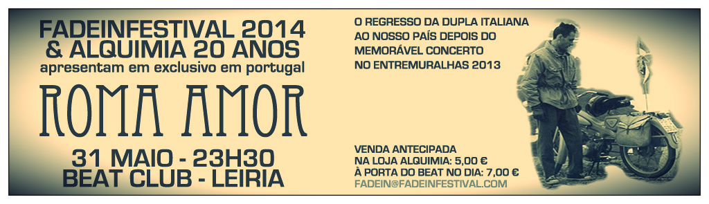 Os italianos ROMA AMOR foram o tesouro que a FADE IN tinha reservado para o ENTREMURALHAS do ano passado e, de facto, a Associação Cultural que organiza esse evento não estava errada. A dupla italiana, oriunda de Ravenna, formada por Euski (voz, guitarra acústica, percussão e teclas) e Michele Candela (baixo, acordeão, castanholas e electrónica) não deixou créditos por mãos alheias e arrebatou todos os que encheram a Igreja da Pena para os ver, num caloroso dia de Agosto de 2013. Agora, num episódio integrado no FADEINFESTIVAL 2014, e numa co-produção com a LOJA ALQUIMIA (espaço fundado na cidade do Lis que comemora os seus 20 anos de existência) a banda volta a Portugal, de novo a Leiria, e de novo para um concerto único no nosso país. Desta vez os ROMA AMOR vão revisitar alguns dos seus clássicos (“A Cosa Pensi”, “Occhi Neri”, “Mon Amor”, “Disertori”, “Ela Vera” ou “Lo Lo Lo”…) e, sobretudo, apresentar “On The Wire”, até à data, o disco mais sofisticado e arrojado da banda – onde nem sequer faltam a versão de “Cambodia” de Kim Wilde ou o indiscritível e belo “Love To Say Goodbye For”. Um concerto absolutamente imperdível para todos os amantes de música com emoções à flor da pele.