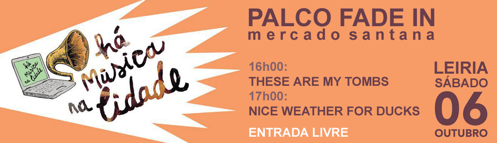 HÁ MÚSICA NA CIDADE teve a sua terceira edição no dia 6 de Outubro de 2012. O evento, organizado pelo JORNAL DE LEIRIA, contou com a participação da FADE IN que dinamizou o palco montado no Mercado de Santana, mesmo no centro da cidade. Para o efeito convidámos os THESE ARE MY TOMBS, banda a quem reconhecemos muitos atributos artísticos e estéticos e em quem depositamos largas esperanças, e os já consolidados NICE WEATHER FOR DUCKS, grupo este aliás, com fortes e estreitas ligações à FADE IN. A grande afluência ao Palco Fade In e a qualidade dos concertos das bandas sob a nossa responsabilidade fizeram com que a participação neste evento de referência tenha sido uma experiência, sem dúvida, a repetir!
